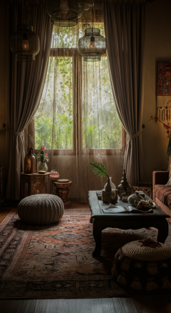 Fun Fact: Many Bohemian designers recommend using light fabrics in your curtains, as they allow sunlight to create soft shadows, enhancing the room’s cozy and relaxed vibe.
