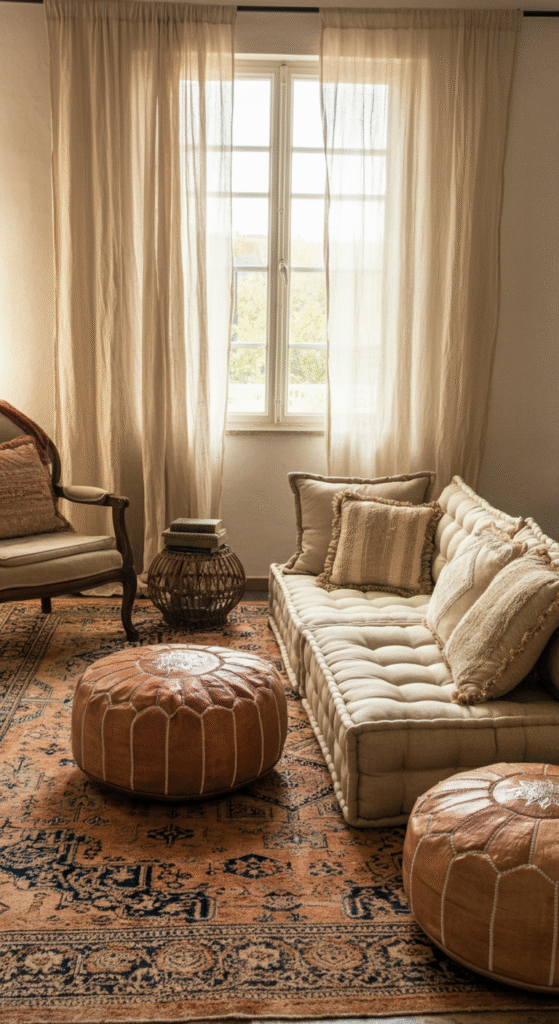In a Bohemian living room, furniture should invite you to sit back, relax, and enjoy the space. A relaxed seating area can include a mix of lounge chairs, floor cushions, poufs, and low-sitting sofas. The goal is comfort and accessibility, making sure your guests feel like they can unwind.