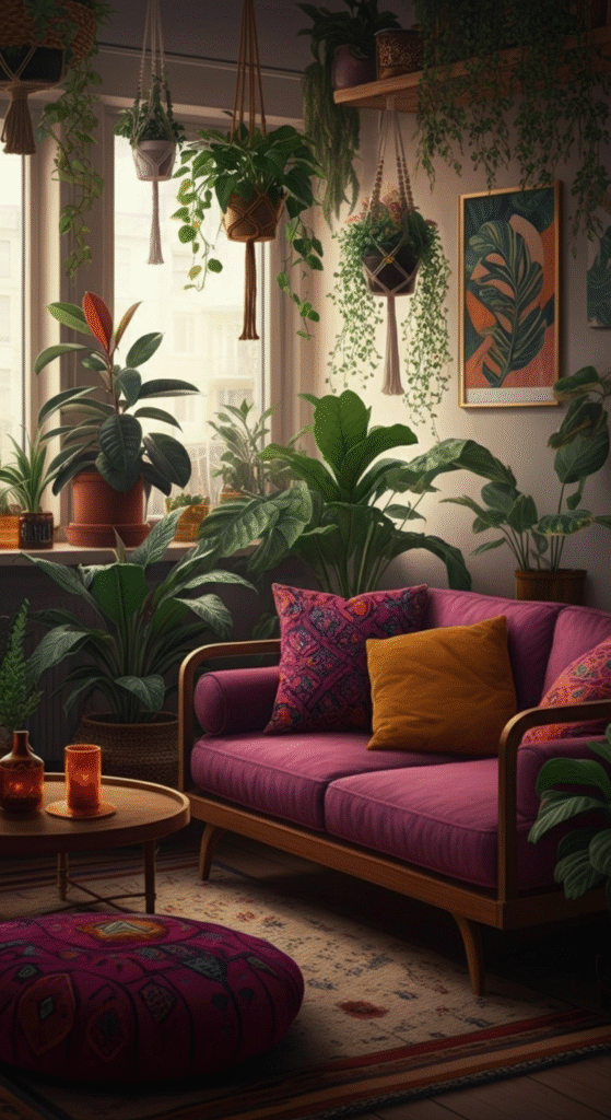 Plants are essential in creating a cozy and vibrant Bohemian living room. Add a mix of tall plants, hanging plants, and smaller potted plants to bring life and color to the space. They also purify the air and make the environment feel fresh and lively.