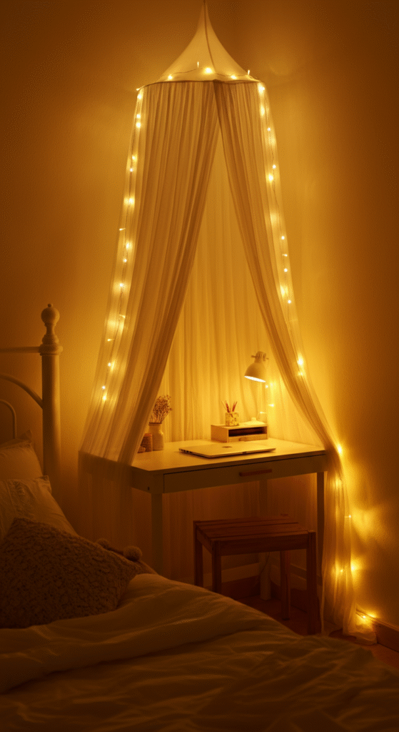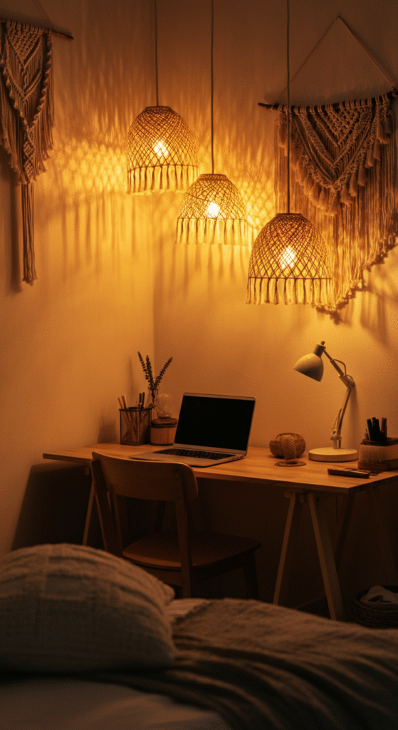 Try lantern style lamps, lamps with woven shades, or textured ceramic bases. Place one on your desk and one near your bed so the whole room feels connected.