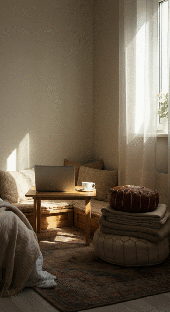 Set up a small low height desk or laptop stand in a quiet corner of your bedroom. Add a stack of floor cushions, a pouf, and a soft throw blanket. This gives a chill lounge office vibe while still being functional.