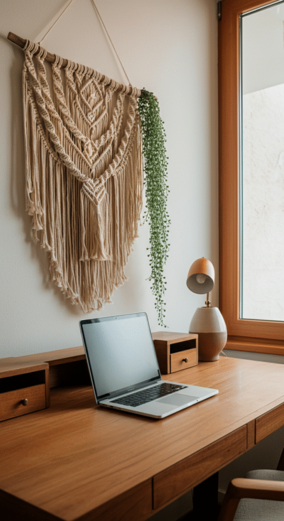 Choose off white or beige macrame for a clean look or go with warm browns for earthier tones. It also helps visually separate your office zone from your sleeping area.