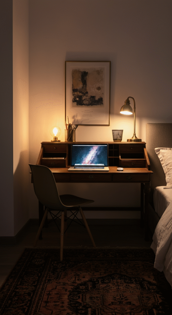 12. Low Light, Warm Lamp Setup for a Calm Workspace