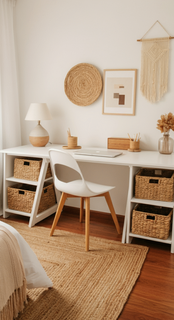 A rattan desk is one of the easiest ways to bring that authentic Boho charm into your bedroom office. The natural woven texture makes the space feel warm and grounded.