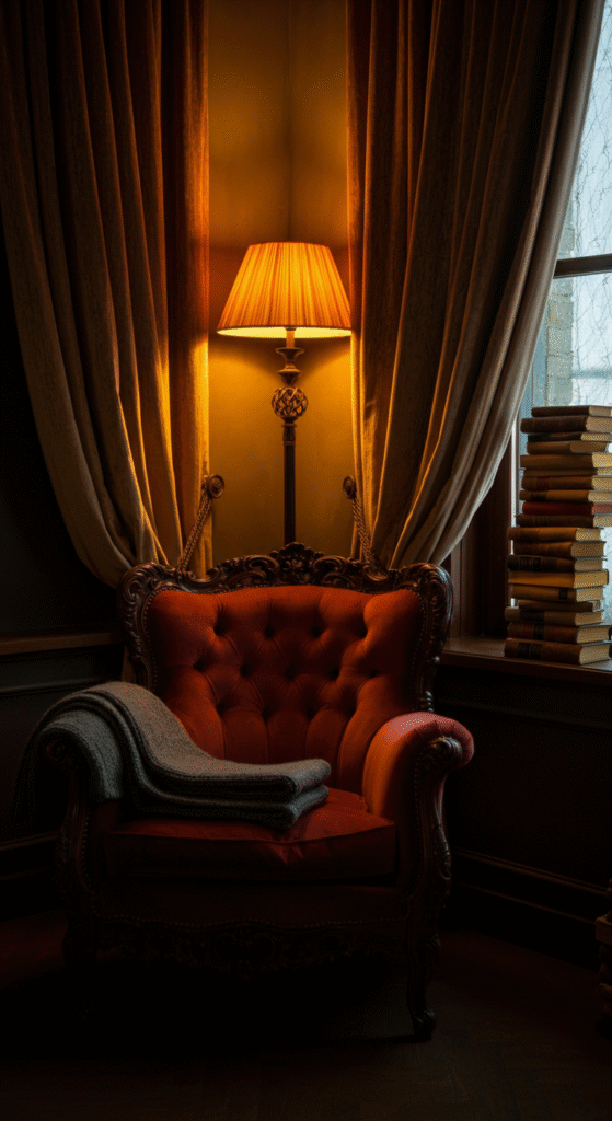Create a small reading nook by placing a comfortable chair by the window, complete with a soft throw, a stack of your favorite books, and a chic lamp. This cozy corner provides an ideal spot to unwind and relax, embodying the blend of comfort and luxury.