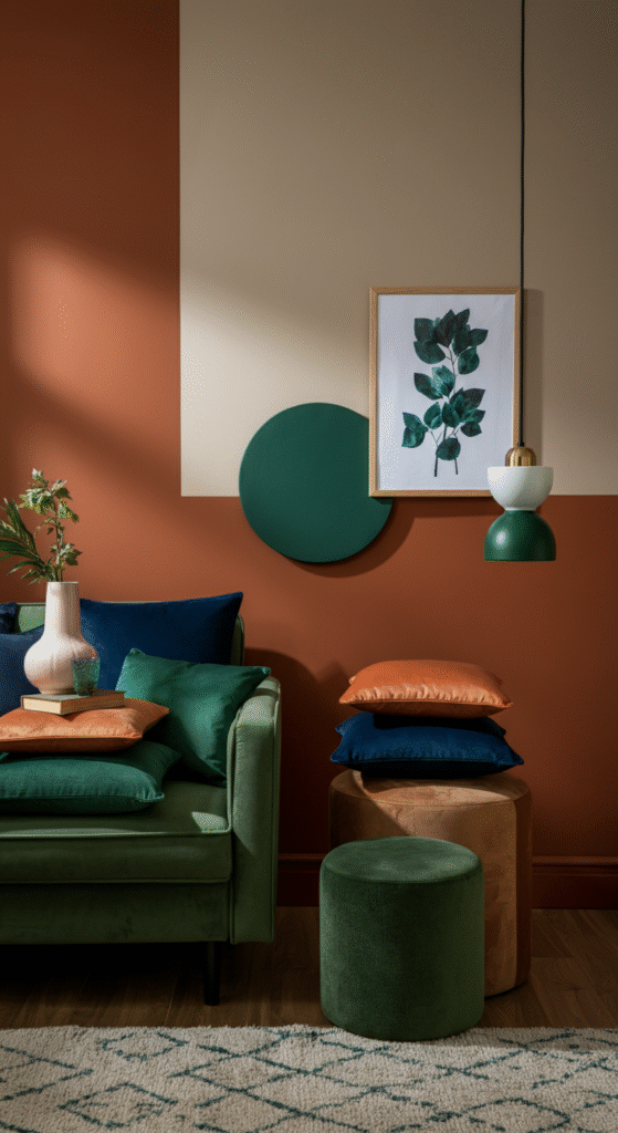 Earthy tones like terracotta, beige, and browns work well. Accent these with deep blues, greens, or vibrant oranges for a touch of richness and luxury.