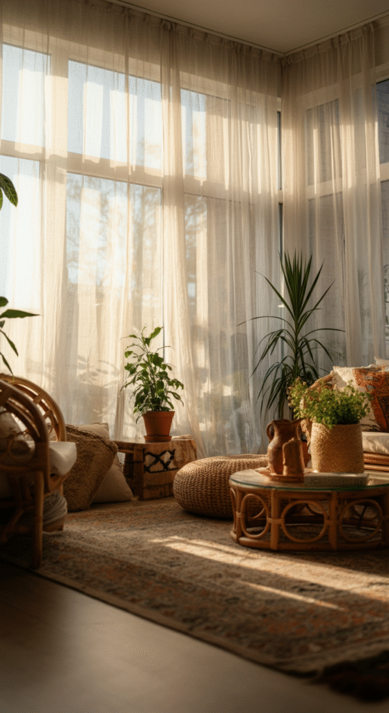 One of the cornerstones of Boho style is bringing nature indoors, and there’s no better way to do that than through natural light. Floor-to-ceiling windows not only allow a flood of sunlight to fill your living room but also provide a seamless connection to the outdoors.