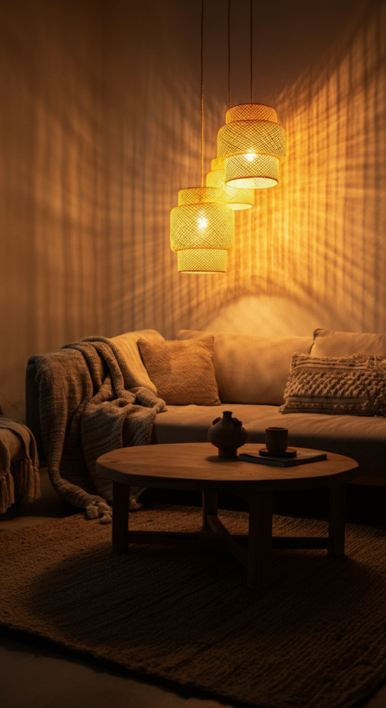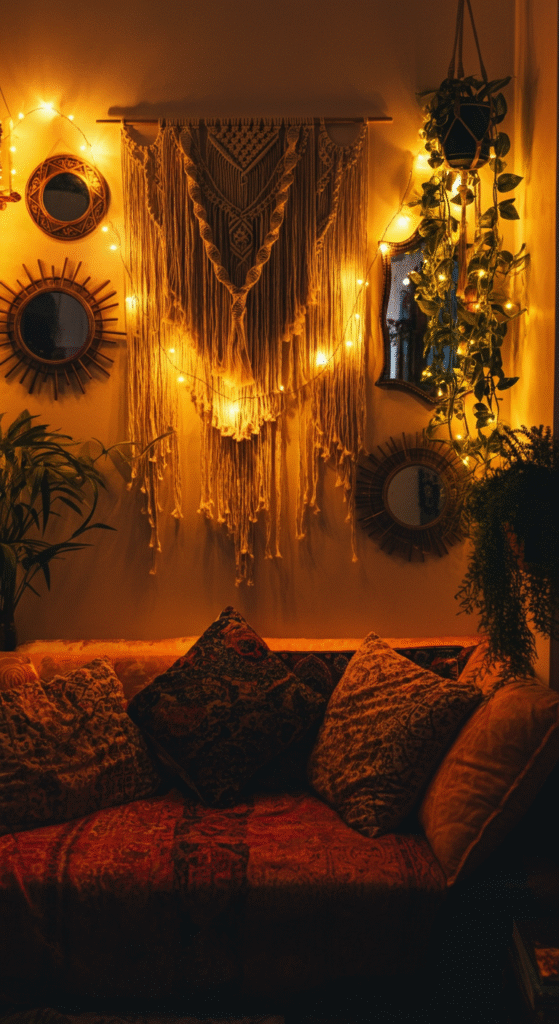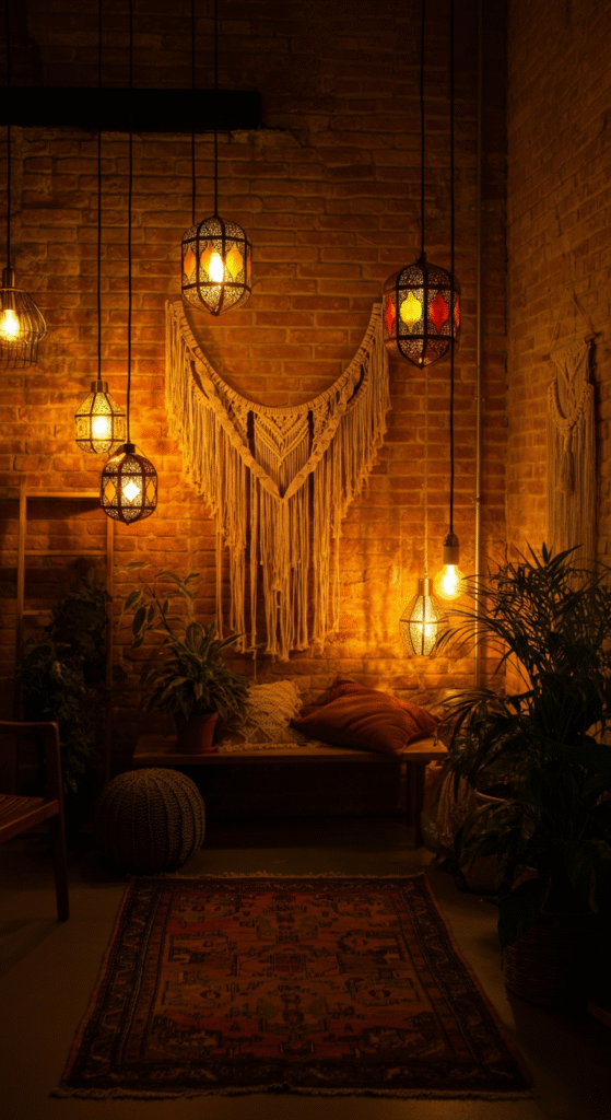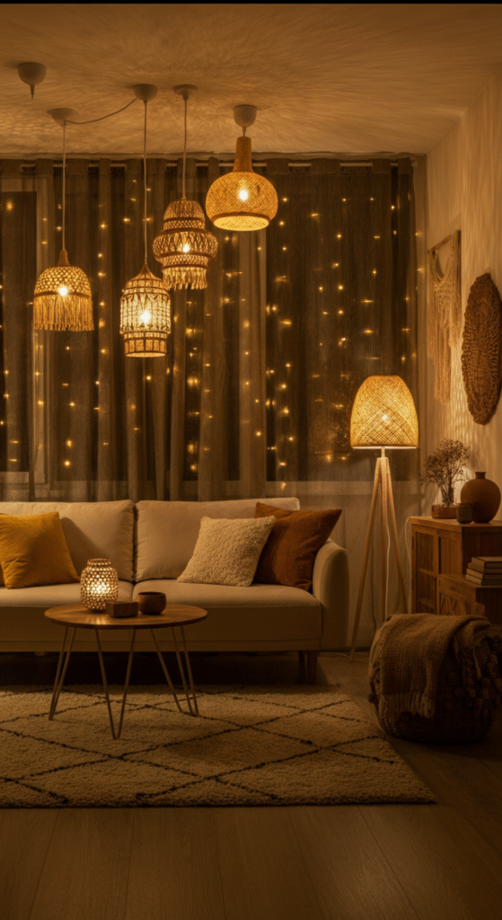 Macramé pendant lights or chandeliers made from natural fibers like jute, cotton, or hemp are perfect for creating a Boho atmosphere. These fixtures not only provide lighting but also act as art pieces, giving your living room a handcrafted feel.