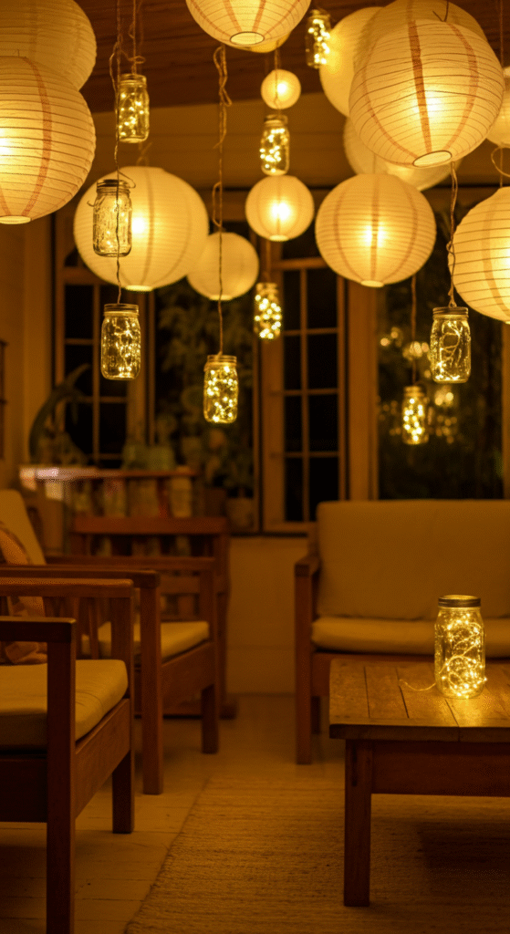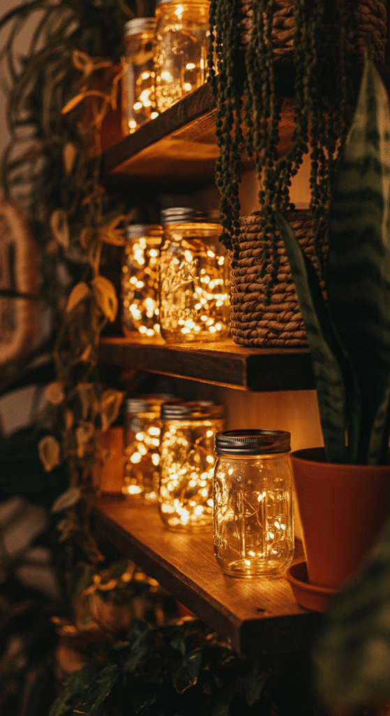 Repurpose glass jars or bottles into unique lighting fixtures by placing string lights inside. This DIY idea is simple yet effective, giving your living room a Boho flair without spending a lot of money.