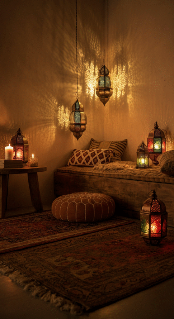 Lanterns are a great way to introduce soft, glowing light into your living room. Whether you’re using traditional Moroccan lanterns or rustic metal lanterns, they bring an intimate and cozy atmosphere to any space.