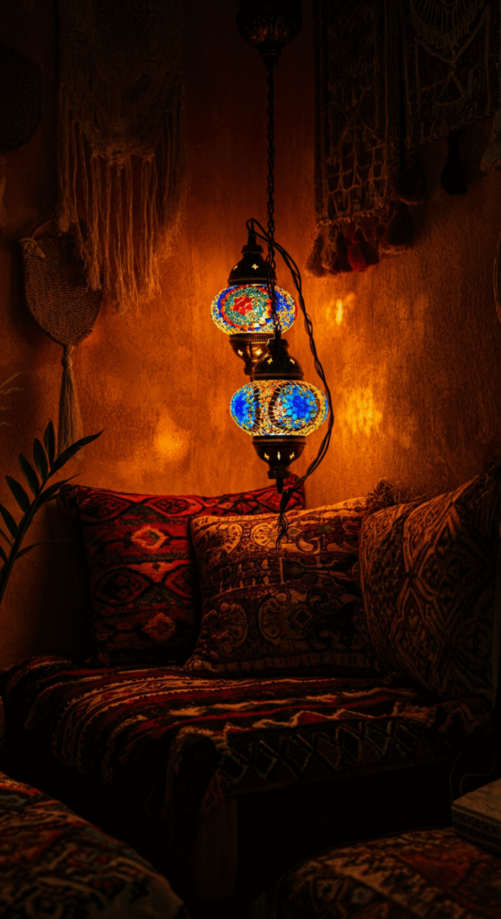 This lighting option works particularly well when you’re looking for something understated but charming. The soft light filtering through the glass creates a calming, rustic effect that’s perfect for Boho interiors.