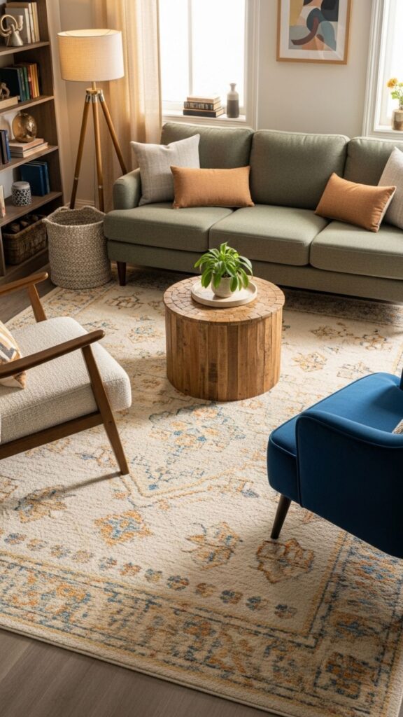 A well-chosen rug can define a small living room layout. Position your sofa and chairs so that at least the front legs rest on the rug, creating a cohesive seating zone. This trick is especially useful in open-plan homes where the living room blends with the dining or kitchen area.