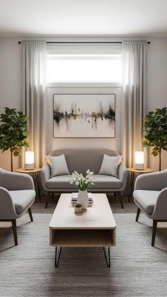 Use a small round coffee table in the center, flanked by chairs and a compact sofa. This arrangement encourages conversation and intimacy, perfect for family gatherings or game nights.