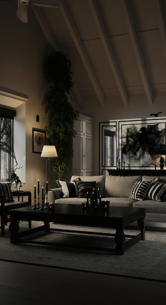 When in doubt, always rely on the timeless elegance of black and white. This color scheme creates a perfect balance between spooky and chic, bringing an air of sophistication to your living room.