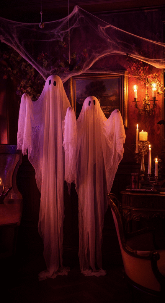 For a more refined take on ghosts, consider using sheer, ethereal fabrics draped across furniture, mirrors, or ceiling fixtures. These fabrics can create an ethereal, ghostly effect without relying on traditional “sheet ghosts.” You can also opt for subtle ghostly art pieces that convey the same mysterious feel.