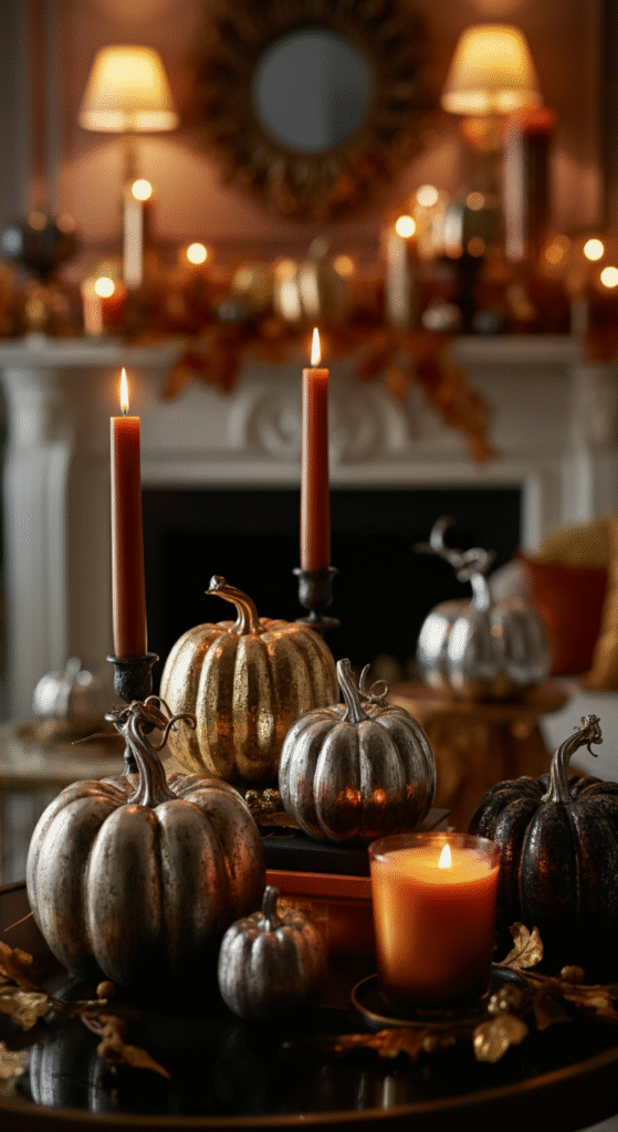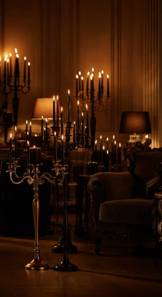 Lighting plays a crucial role in setting the mood of your Halloween décor. Swap out your regular lightbulbs for warm, dimmable ones, and place candles around the room for a cozy yet spooky feel. To keep it chic, use tall candlesticks in gold or black, or opt for glass candle holders for a more refined look. Keep the candles in varying heights for an added touch of drama.