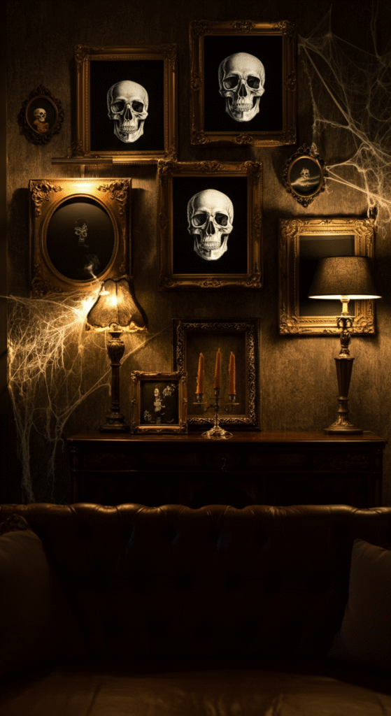 When it comes to wall art, you don’t have to go for tacky posters or overly creepy imagery. Instead, choose elegant prints like black-and-white photographs of Victorian-style portraits, skulls with artistic detail, or abstract art with subtle Halloween references. These pieces can be hung on your living room walls to elevate the space.