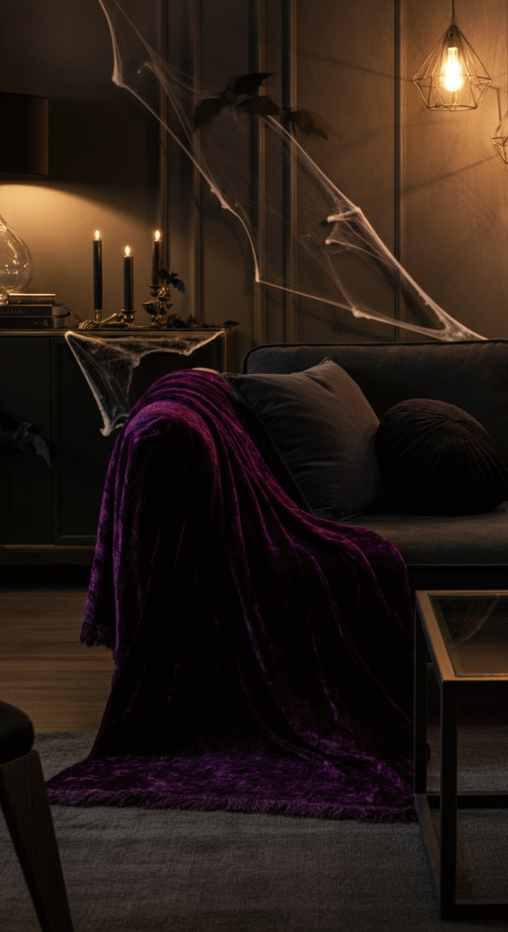Velvet is the perfect fabric for a Halloween living room décor makeover. A velvet throw blanket in a rich, deep color such as dark purple, emerald green, or midnight blue can instantly add an element of luxury and elegance to your space. Drape it over your sofa or chairs to give the room a touch of class while keeping things comfortable.