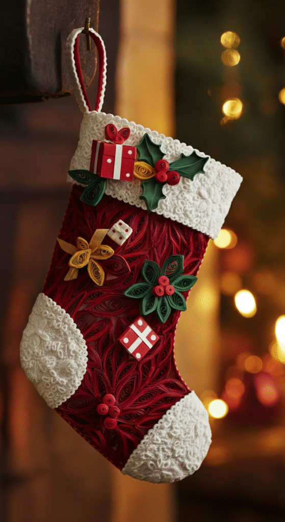 Description: Start by creating the basic shape of a stocking using curved coils and strips of red, white, and green paper. Then, add fun details like quilled holly leaves or tiny quilled presents to make your stockings stand out.