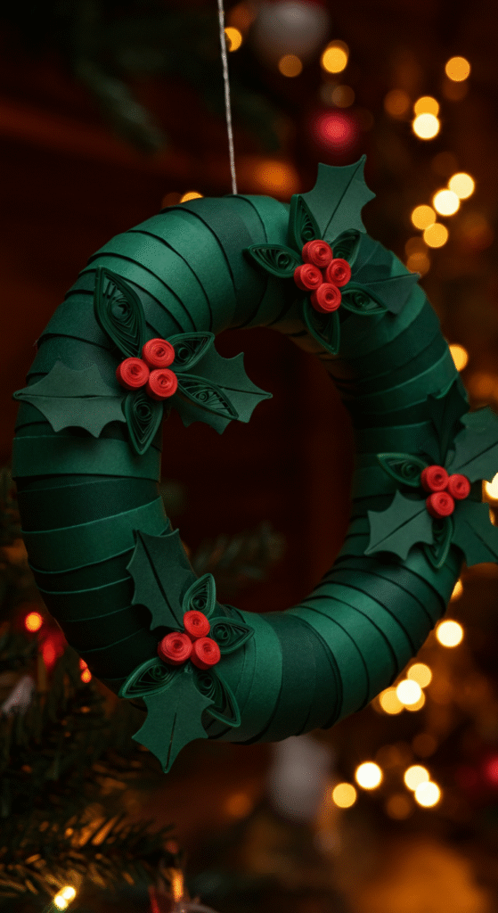 Description: Begin by creating a base using rolled paper strips and form them into a circular shape. Next, add details like quilled holly leaves, red berries, or even small quilled Christmas presents to make your wreath pop. The beauty of a quilled wreath is that it can be made in any color combination—green and red for a traditional look, or metallic gold and silver for a more modern style.