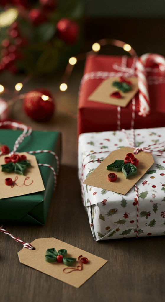 Description: Begin by cutting a small tag from cardstock and using quilled paper to create intricate designs like hearts, holly leaves, or even the recipient’s initials. Attach these handmade tags to your gifts with a ribbon for an extra-special touch.