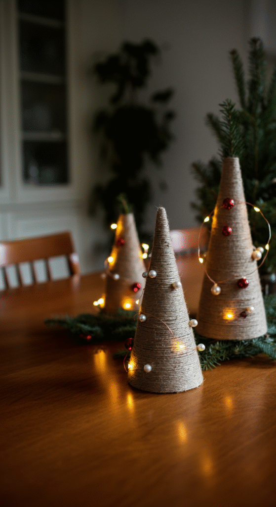 Wrap cone-shaped foam or cardboard with jute twine or yarn. Add tiny beads, pearls, or fairy lights for texture.