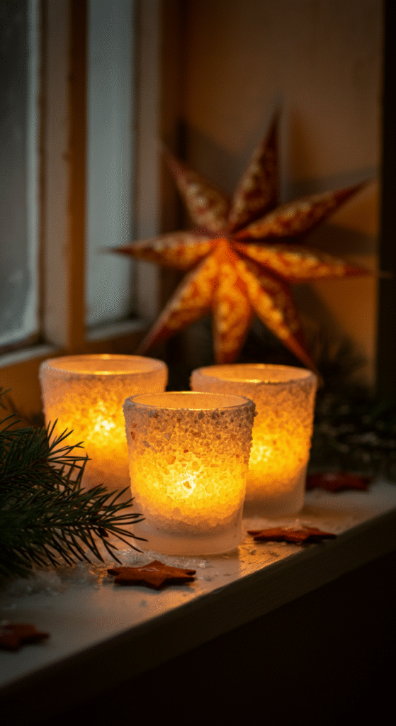 Coat the outside of a glass jar with glue, roll it in Epsom salt, and let it dry. When lit, it gives a snowy glow — like winter captured in glass.