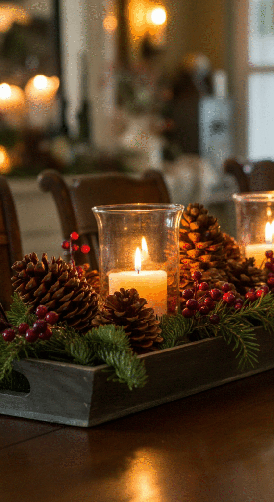 Use what you already have — pinecones, evergreen branches, candles, and ornaments. Arrange them in a wooden tray or glass bowl, and sprinkle a bit of faux snow for that extra festive touch.