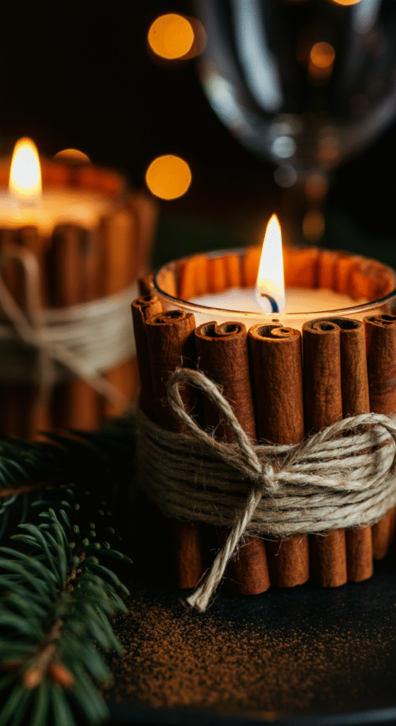 To create these, simply wrap cinnamon sticks around a plain candle using twine or ribbon. The warmth of the flame gently releases the spice’s scent, making your space feel festive and cozy.