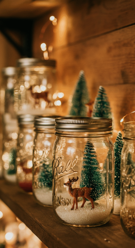 Fill each jar with water, a pinch of glitter, and a small holiday figurine glued to the lid. Once sealed, shake it up and watch the magic swirl.
