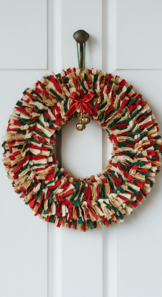 Cut leftover fabric pieces into strips, tie them around a wire wreath frame, and fluff them until it looks full and festive. Choose color themes like red and green for a traditional vibe or gold and white for something elegant.