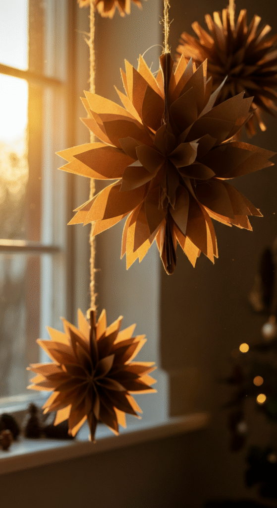 Stack 8–10 brown or white paper bags, glue them together in a fan shape, and cut patterns into the sides. Open them up, and you’ll have giant 3D snowflakes perfect for walls, ceilings, or windows.