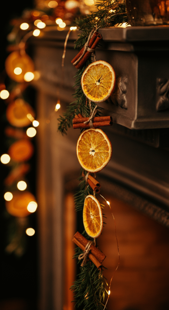 Slice oranges thinly and dry them in the oven at low heat until crisp. String them together with cinnamon sticks and bay leaves. The scent is incredible, and the look is timeless.