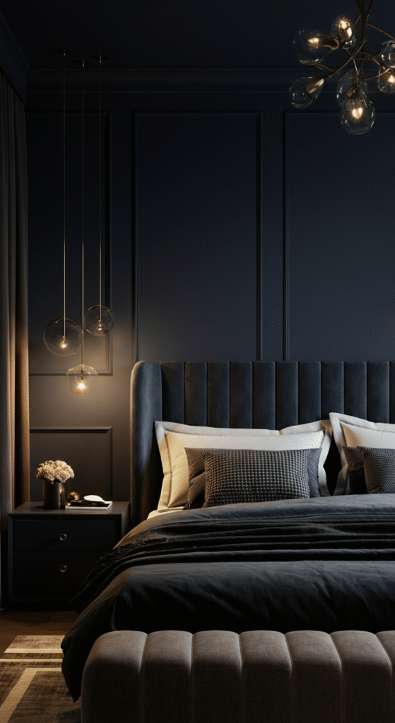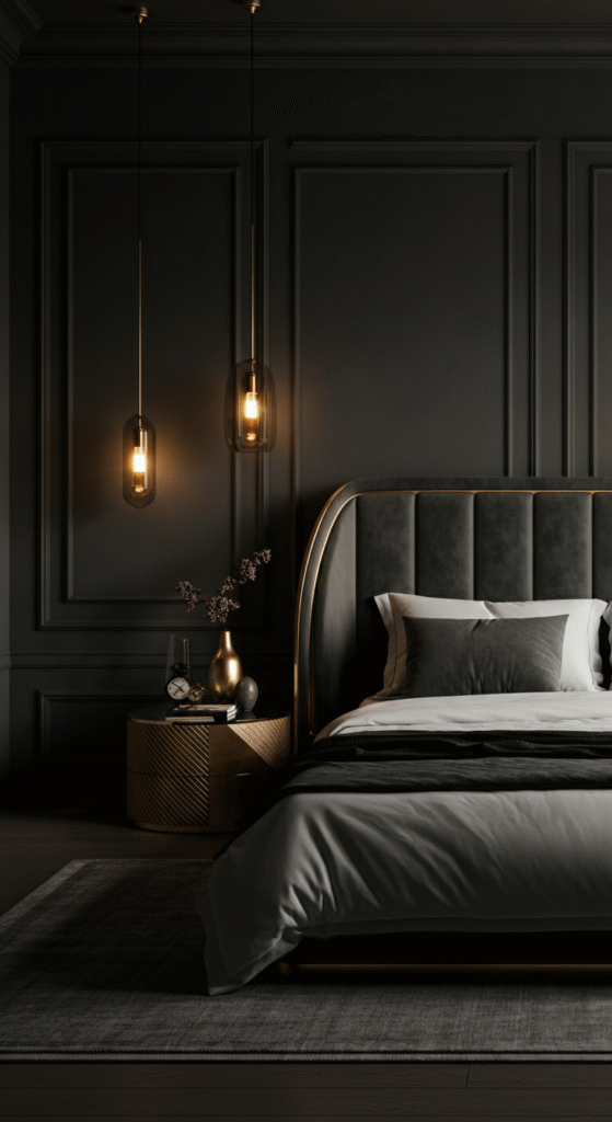 Do you know many luxury hotels use charcoal because it photographs beautifully and makes metallic décor pop instantly. Add soft white bedding and warm lights and the bedroom turns into a cozy glam retreat.