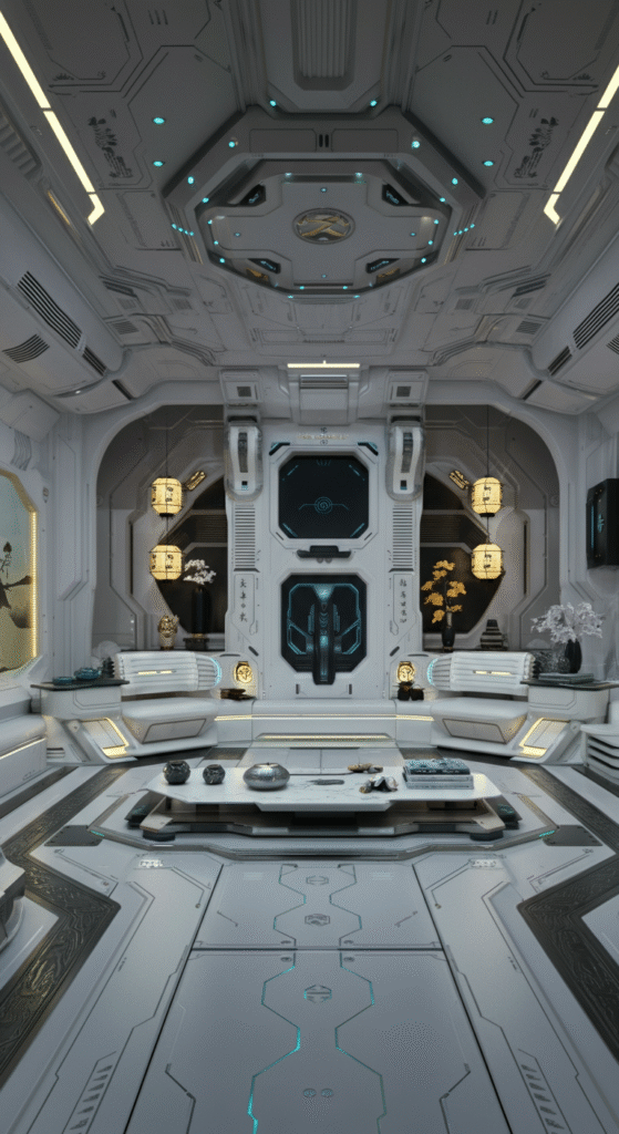 Use glossy white furniture, LED strips, and metallic finishes. Keep symmetry in mind—everything should feel balanced and forward-thinking.