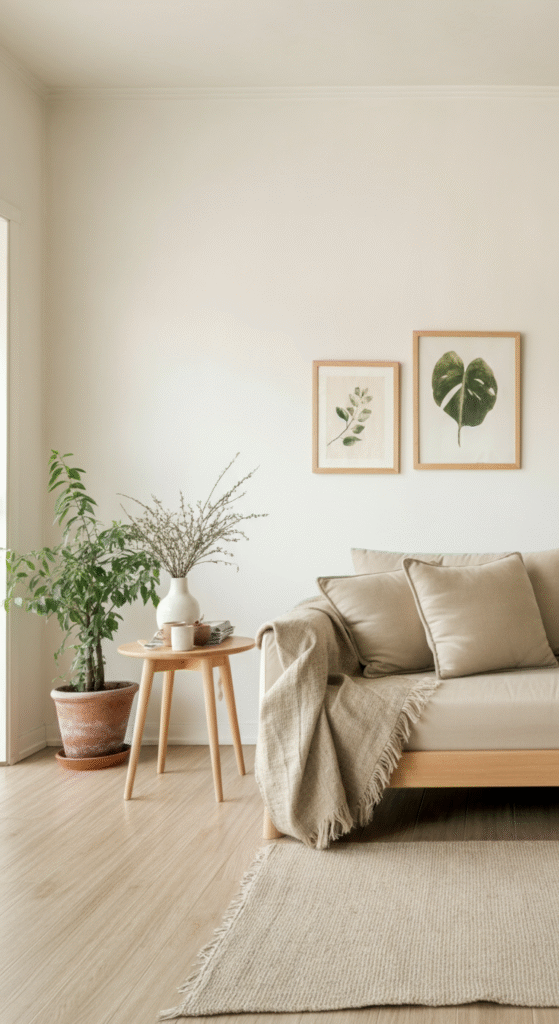 Use natural textures—wood, linen, wool—and pair them with white or beige walls. Keep decorations minimal but intentional: a potted plant, framed line art, or a cozy throw blanket on your couch.