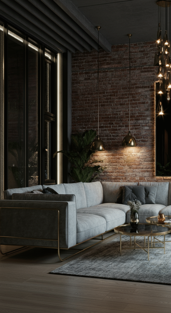 Use exposed brick backdrops, metallic furniture accents, and pendant lights. A large rug under a sleek sofa anchors the room, while an open floor plan keeps the space dynamic.
