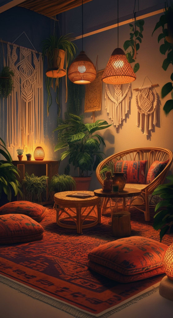 Layer patterned rugs, throw pillows, and woven furniture. Mix warm earthy tones with pops of vibrant colors like mustard yellow, teal, or terracotta. Plants are essential—try hanging vines or large potted palms for that organic touch.