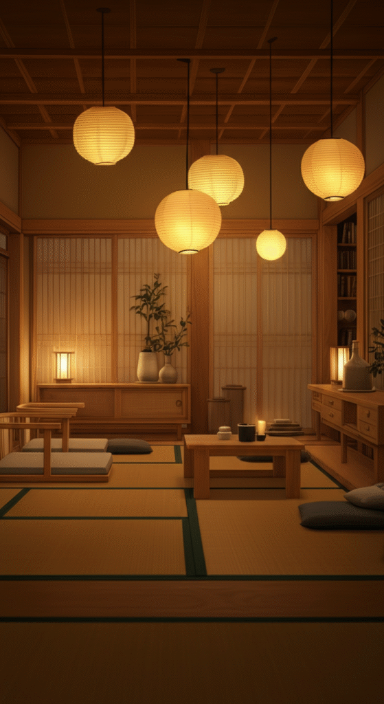 Neutral tones, wooden finishes, and low-profile furniture define this look. Add sliding shoji screens or paper lanterns to give a nod to traditional Japanese elements.