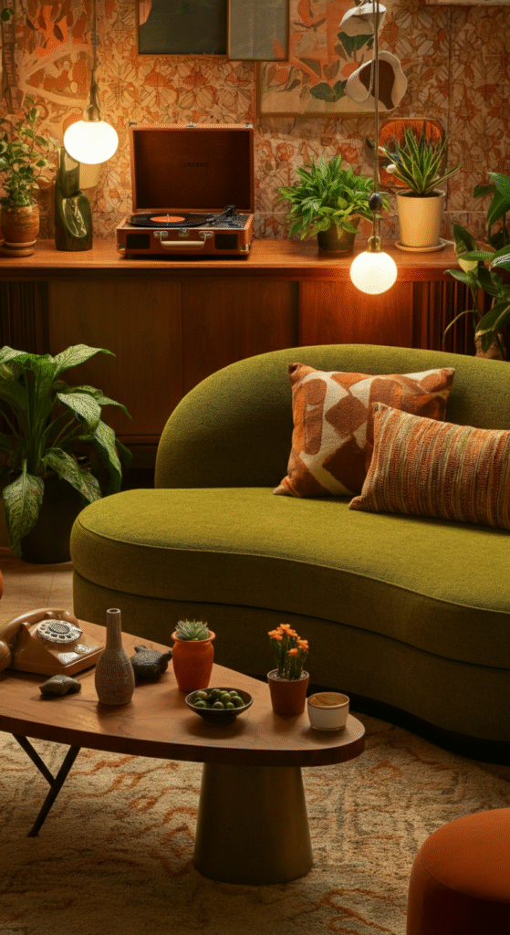 Think rounded furniture, bold prints, and statement colors like burnt orange, olive green, and mustard yellow. Add a low coffee table and a record-player corner for that nostalgic vibe.