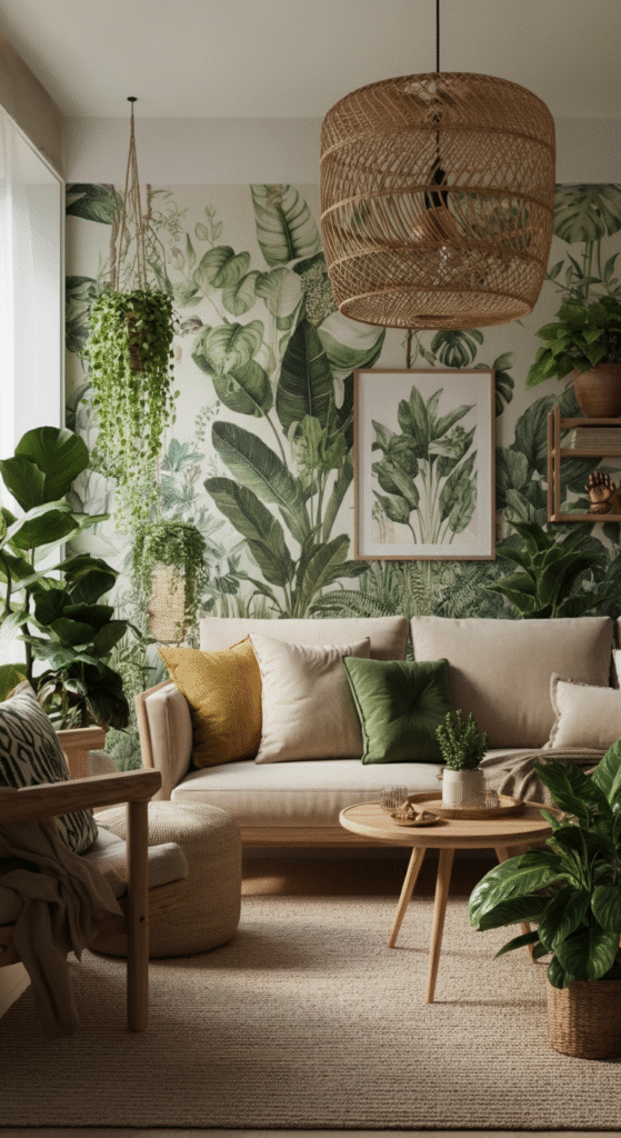 Use botanical wallpapers, green sofas, or earthy wooden furniture. Incorporate natural light sources, or simulate them using warm white lamps.