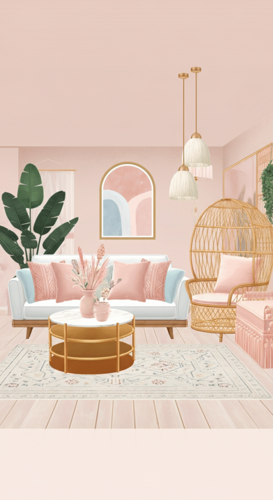 Create a dreamy Zepeto living room using hues like blush pink, baby blue, lavender, and mint. Mix with gold or white accents for a polished finish.