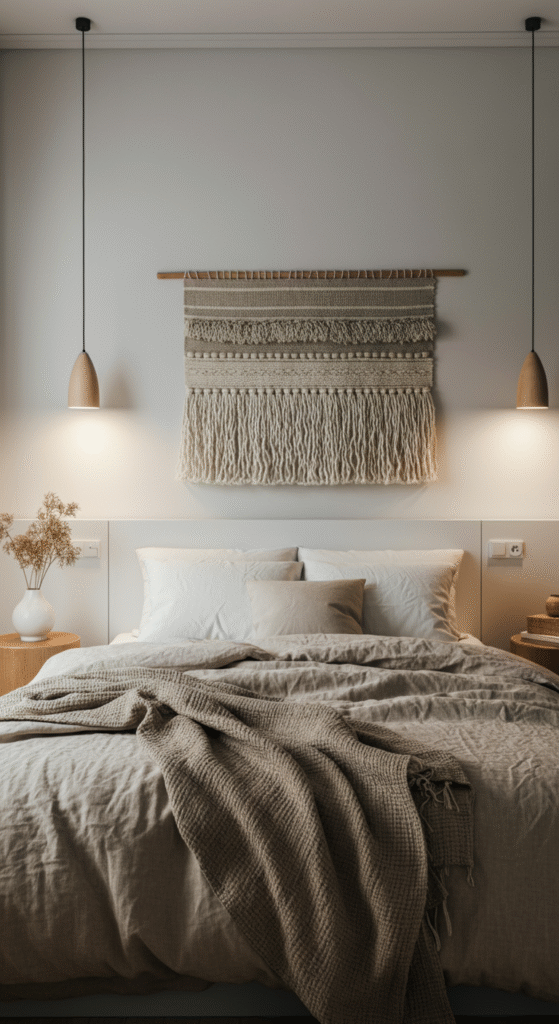 If you want a cozy or boho-modern feel, hang a large woven textile behind your bed. Choose macrame, linen, wool, or handwoven patterns.