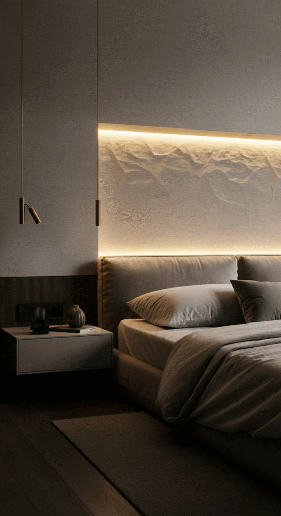 There’s a little secret interior designers use. Removing the headboard doesn’t make the room look empty. It actually opens space for textures, artworks, lighting, and creative wall treatments that instantly make the room feel curated and expensive.