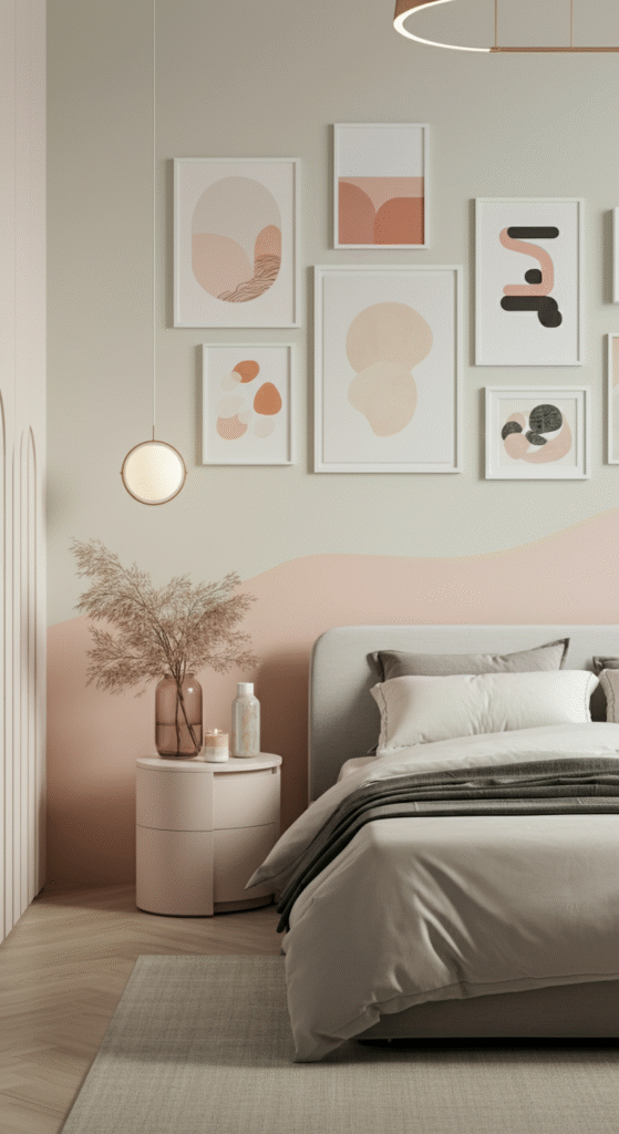 A single oversized artwork instantly anchors your bed without needing a headboard. This trick works best when you choose a piece with calming colors, soft lines, or bold abstract patterns.