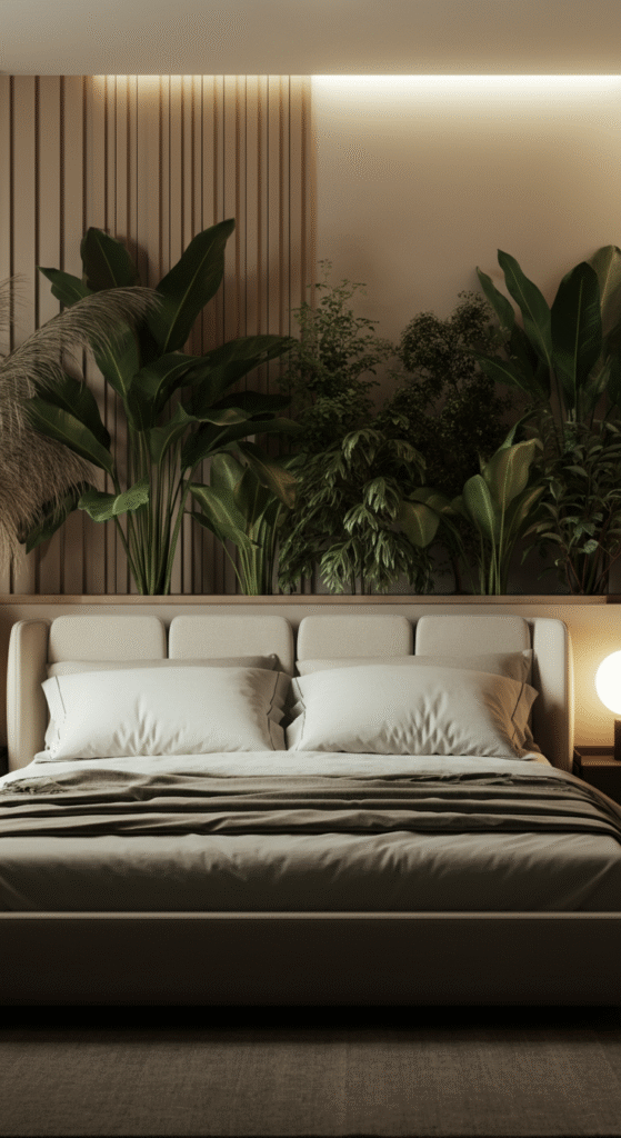 The greenery acts like a living headboard. For an ultra-modern vibe, stick to planters with clean lines and solid colors.