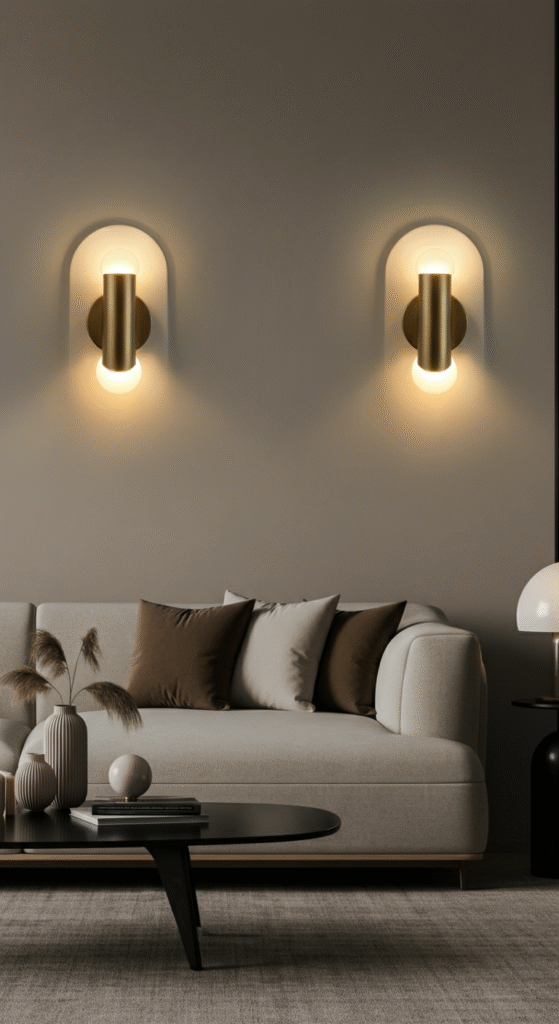 Opt for fixtures with geometric shapes, metallic finishes, or frosted glass globes. Position them symmetrically beside your sofa or artwork for an elevated, cohesive look.