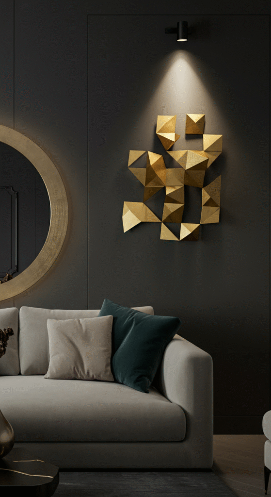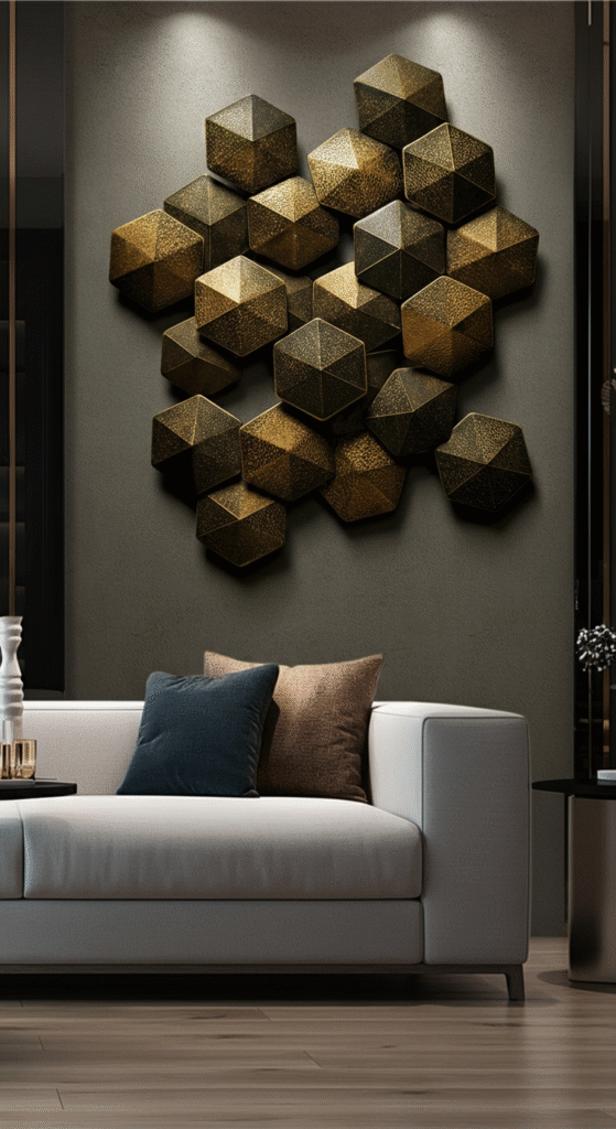 From geometric shapes to organic, nature-inspired designs, metal wall sculptures reflect light beautifully and bring dynamic energy to the space. For modern interiors, black and gold finishes are particularly striking.