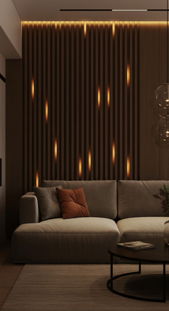 For a bold, architectural touch, textured wall panels make an instant impact. Think wood slats, concrete finishes, or even 3D gypsum panels that cast beautiful shadows under lighting.