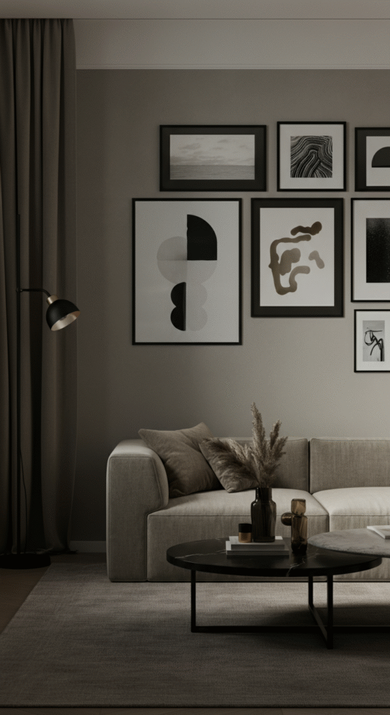 The gallery wall remains a design classic—but the modern take involves asymmetry, varied frame sizes, and mixed media. Combine art prints, mirrors, and even personal photographs for a curated yet lived-in feel.